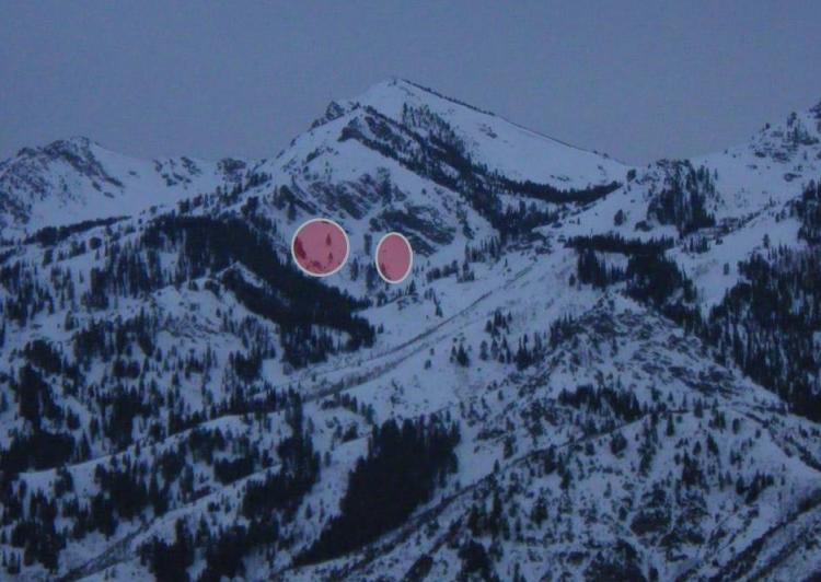 Looking through binoculars from Mountain Green this evening, I could see dozens of wet sluffs between Snowbasin and Thurston Peak on the East side of the mountains. I also saw two medium sized wet slabs just NE of Thurston Peak - the approx. location of both slabs are marked on the map above, and shown on the photo below.