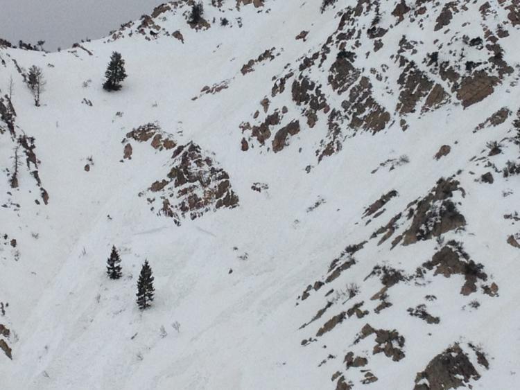 Loose wet snow cascading over the rocky/cliffband section triggered this soft slab. Unstable wet snow conditions precluded investigation of the crown, however, tests in adjacent terrain led me to believe that it failed on intact 8mm SH likely buried in early February.