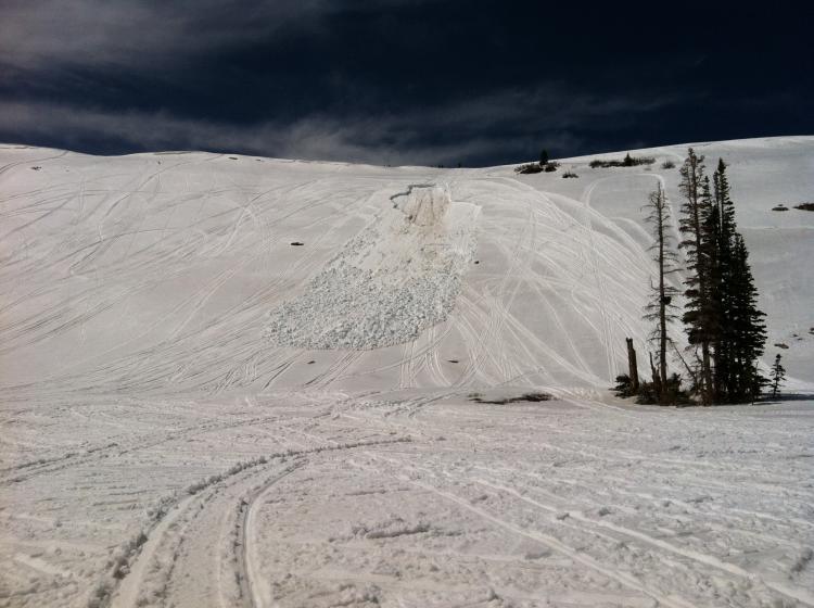 This slide occured minutes before our group dropped into the Jordan Canyon bowl during the Fairview Shootout on Saturday, March 31, 2012. There was a group of snowmobilers at the bottom of the hill below the debris that were just collecting themselves and assessing the damage to one of the sleds as we arrived. According to them, they had about 3 or 4 riders racing up the hill and when they crossed the slide area, it broke behind them and slid. They were unaware of the slide and when they turned around and started back down the hill, they realized what had happened but were unable to avoid the crown or the debris. One sled lost control and rolled from jumping off the crown. Nobody was buried or injured.