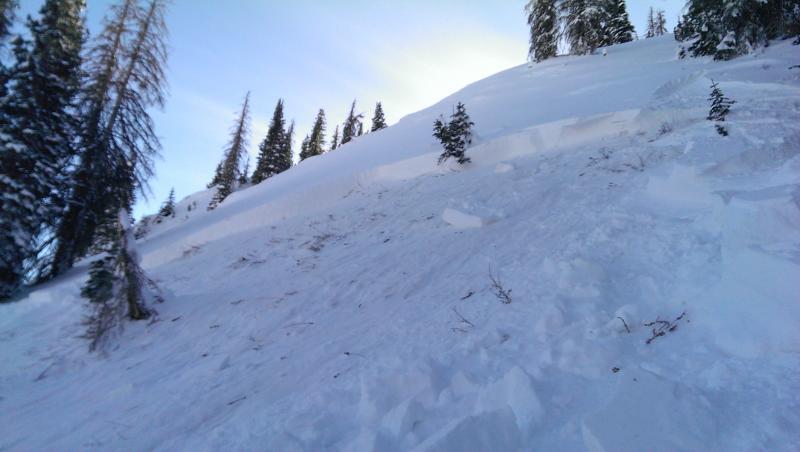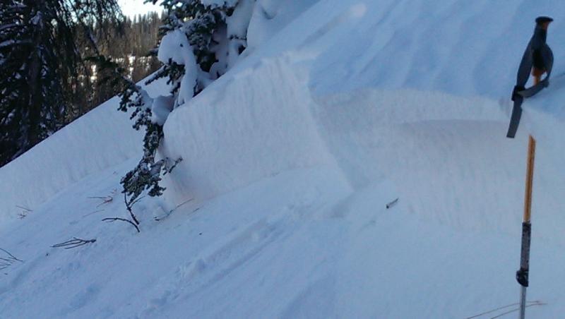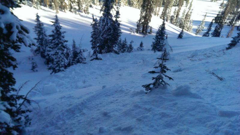 After digging a pit higher up I was navigating down in the trees (aside from a small low angle section mid slope) and I saw an opportunely to put some stress on a rolling steep section near the bottom. As I suspected the slope failed on the facets just above the early season snow. The slide was small but deep and although it would not have buried anyone, I could have easily twisted a leg on the trees below. My previous stability tests higher on the slope failed on the same layer ECTP15 Q2.