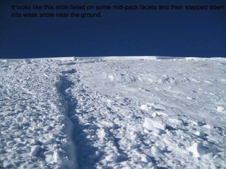 I combined these two slides on Double Hill. Both looked to have been triggered either low or about mid-slope. It would appear that the facets in the middle of the snow pack collapsed and once the support was removed the slide stepped down into weak snow near the ground and pulled-out into deeper snow off the ridgeline.