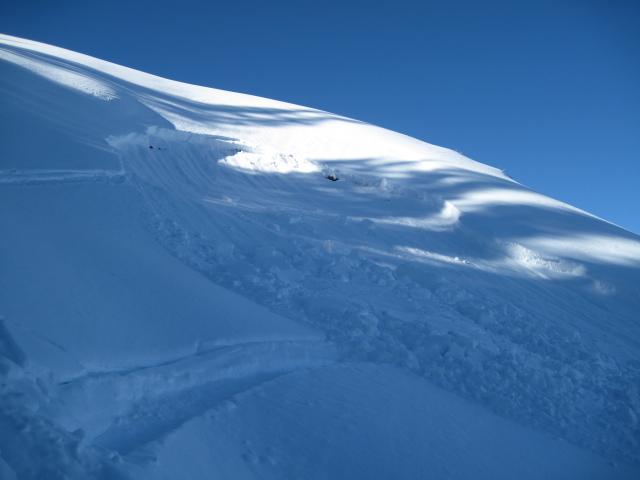 Small sled triggered slide from a day or two ago. This slide again failed on the weak faceted snow in the middle of the snow pack and then stepped down into weak snow near the ground. Not a big slide and did not travel far as it ran out of slope angle, but enough to work a person over.