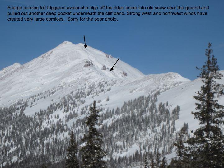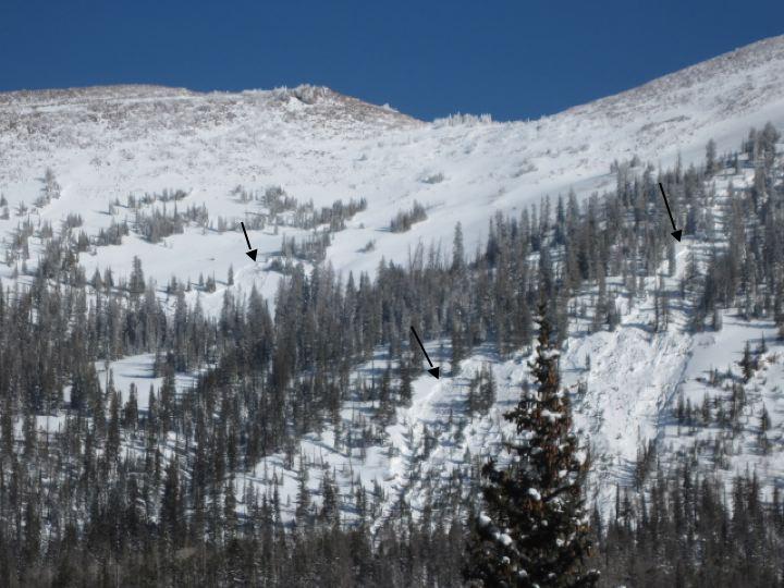 This is another natural avalanche off Kletting Peak, but it is a west aspect and looks some what recent? I'm sure the strong and steady west and northwest winds have overloaded many of these areas that are shallow, rocky and have weak snow near the ground.