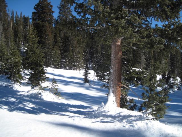 I noticed some of these bigger trees had old snow high up on the trunk indicating how high and fast the debris was moving when it hit the flats several hundered feet below the crown.