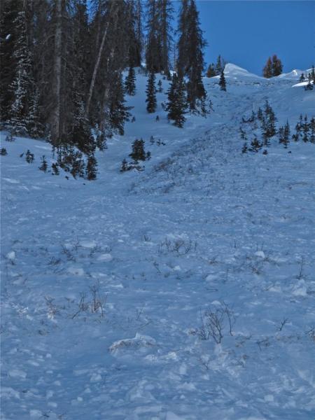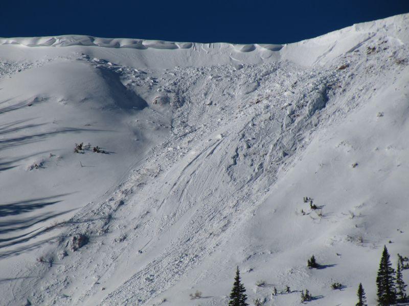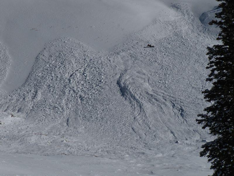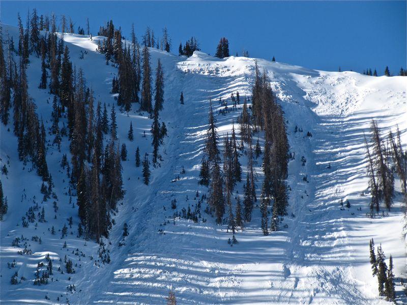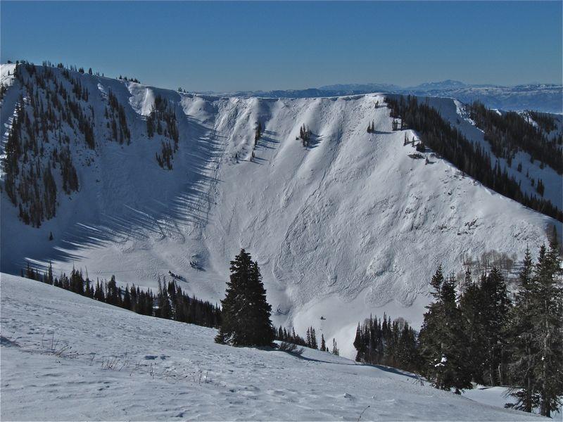 Two main avalanches of about 1000 feet wide each took out most of the rest of the snow that was still left after this bowl avalanched the previous week. Between the two natural avalanche cycles, most of this bowl has avalanched. Many locations broke to the ground leaving very little snow on the bed surface.