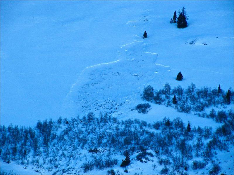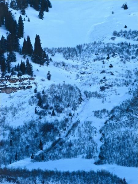 This is another example of an avalanche that pulled out mid way down the slope. The UAC forecasters speculate the reason is that there is more wind crusts and slabs that are giving the upper starting zones a little more strength over the persistent weak layers. Our storm from mid January wasn't enough to overload many of these starting zones. Farther down the slopes where the previous crusts and slabs were not present, it didn't take as much weight to make them fail. This means that the upper starting zones that didn't avalanche are still holding the buried persistent weak layers.