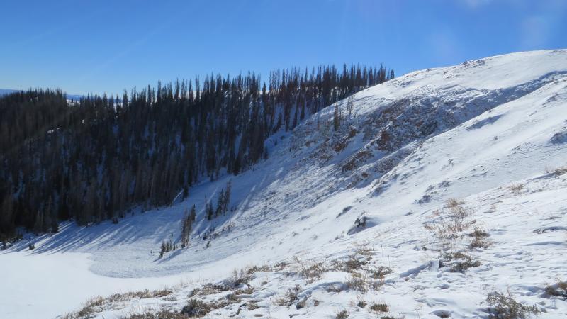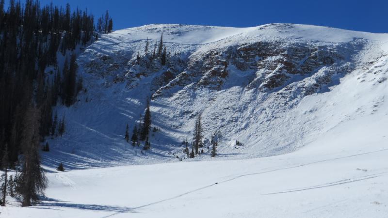 Noted many east facing natural slides as the area is heating up. Everyone of them was down to the ground and on steeper angled wide open slops. The one in this picture was one of the bigger slides that travel well out into the flats cover older snowmobile tracks.