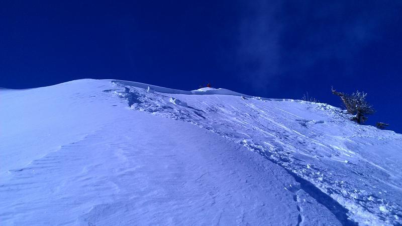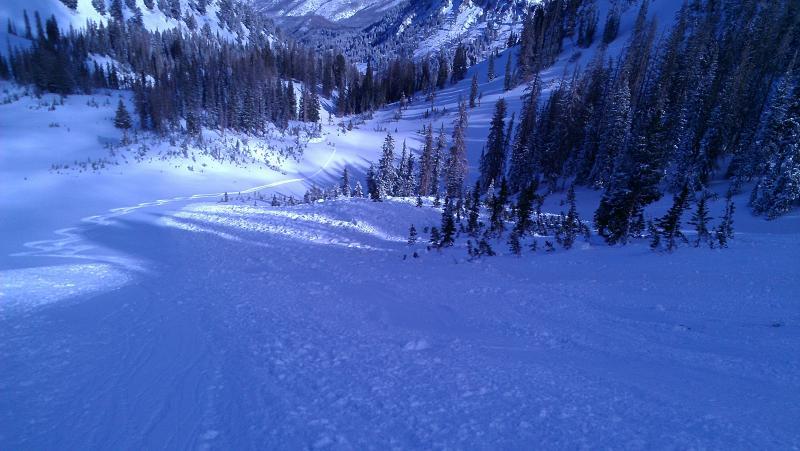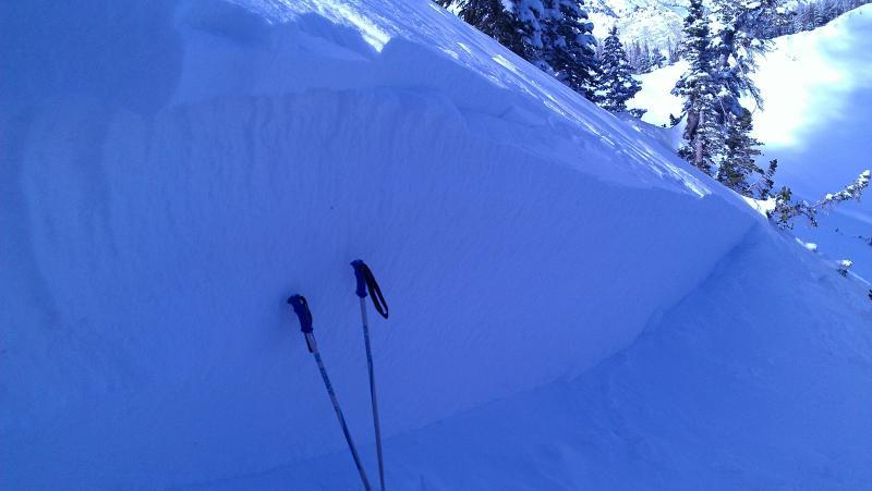 We had a remote triggered avalanche from a group standing on the ridge of main shingle mill drainage in Cascade today at 12:30. The party on the ridge felt the settlement which remotely triggered the avalanche on the NE aspect at 10,000'. Averaged 1-3 feet deep, 100' wide, and ran 600 feet. Most interesting feature was that the slab stepped down mid-slope up to 5 feet deep. The photo with the ski poles is from the step down crown line. We might be seeing a start of things to come as we are developing the mid-pack slab over the basal facets. We'll see what these next few storms bring. I have a feeling that we will tip the balance soon in the Cascade zone, and the core will not be far behind...