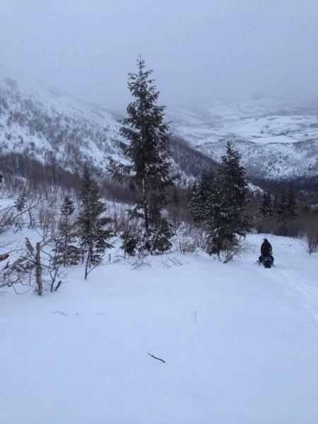 I did not attempt to get to the crown to assess the depth. We felt it was too dangerous. There were 2 additional avalanches in Hanks Canyon that probably occurred on Saturday night. This slide ran 2810 ft based on an estimated release point. When we discovered the slide, it was covered by 5 to 8 inches of new snow. About 2/3 the way down from the crown, there was a pine tree in the middle of the avalanche path that had limbs broken by the avalanche that were 20 feet above the level of the current snow pack. The attached picture shows a pine tree on the very edge of the avalanche that shows the depth of the avalanche to be about 12 feet. (Flagging and snow packed against the trunk of the tree.)