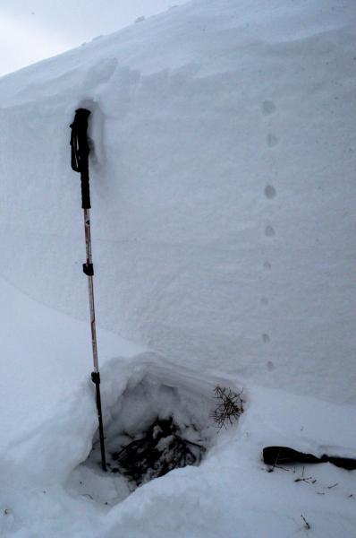 The crown averaged 4 feet but was up nearly 6 feet in some spots. It failed just 6-10" above the ground on basal facets/depth hoar. It appears that the failure layer was just above or below a very thin rime crust (date of crust unknown).
