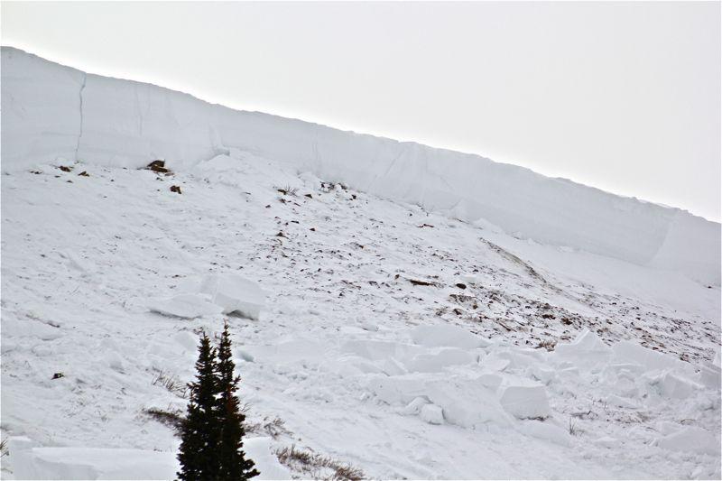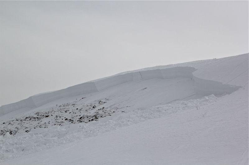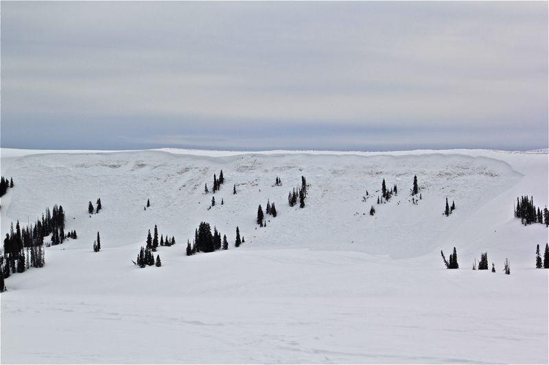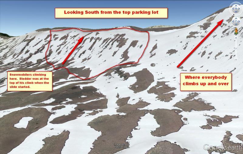 Rider was hill climbing in the looker right half of the bowl. At apex of highmark the slope released. He was able to ride the avalanche on his sled most of the way down before getting bucked off and thrown near the toe. Luckily, he was not buried or seriously injured. Photos: Cade Beck
