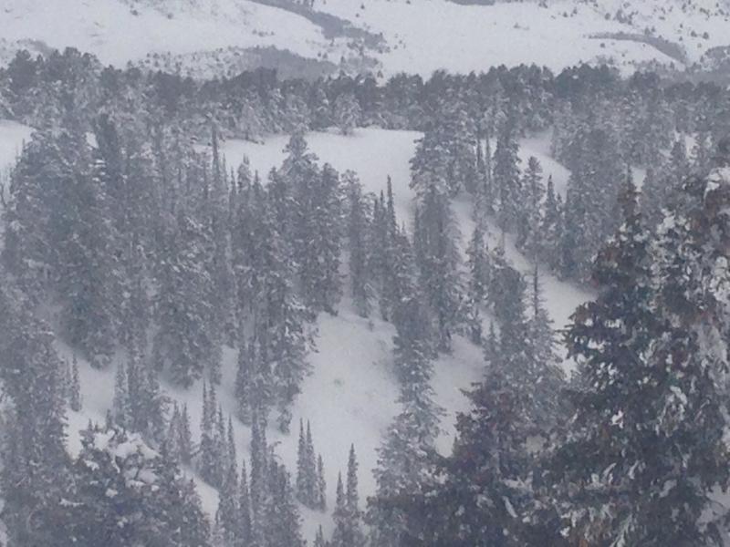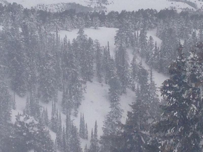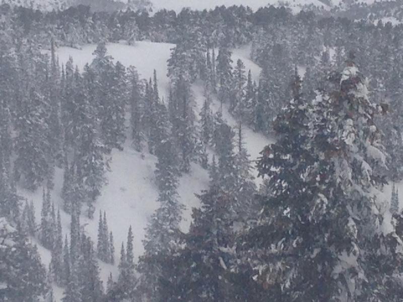 During our am upper mountain check we spotted this crown down the ridge in the north facing James peak drainage. Looks to be pretty fresh likely from the loading from Friday night wind events, definitely hard wind slab failing on early season basal facts and running on the ground and arresting on the trees below. The tree line seems to be the connect the dot of weakness where the crown line is exposed. Pretty consistent westerly winds with frontal passage today, graupel filled in tracks and was not real coherent to the existing rain/wind crust. Probably more naturals in this north facing terrain, finally getting some visuals in to this terrain more to come!