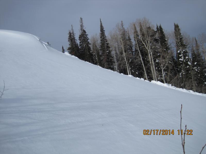 had to take skis off coming over little peak, SW fetch blown to rocks, small wind pocket released naturally on NE slope, only 30' wide, ran to firs/trees 50', crown average 3', small pocket, but I would not like to take even that ride and get slammed into trees at bottom by refrigerators, blocks remained together, so other than crushing you, unknown if it could bury you