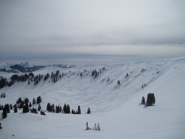 Forecaster comment- Ted found this large natural during his travels in Whitney Basin on Mon. Feb. 17. We tried to pinpoint when it possibly occurred. Westerly winds have dominated since the very active zonal pattern developed in early January. This pattern tends to strip snow from Superbowl. However, looking back at Windy Peak wx data, southwest winds made their first appearance late in the evening of the 15th and blew into the 40's and 50's for 13 hours, essentially sealing the fate for a very weak, fragile snowpack.