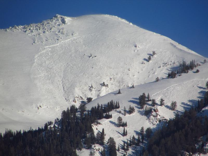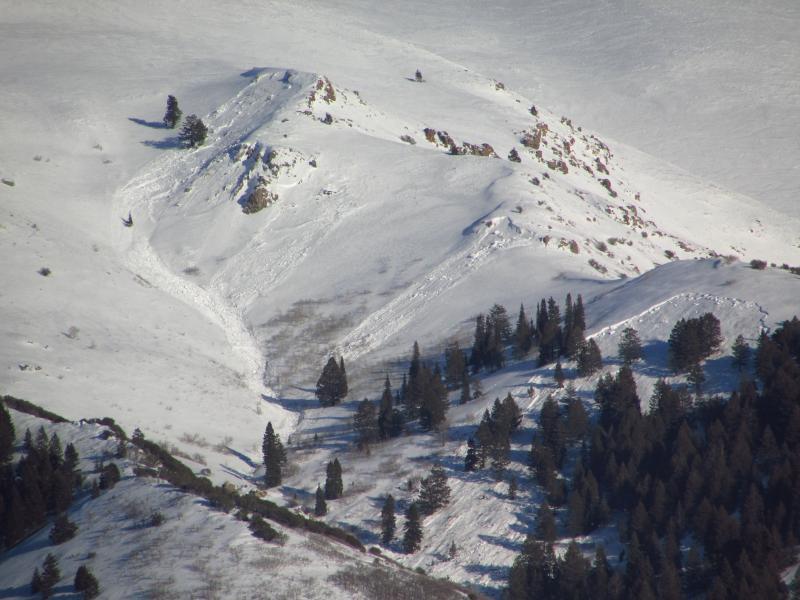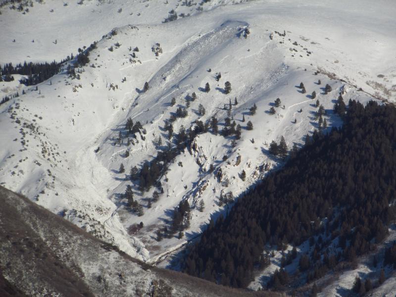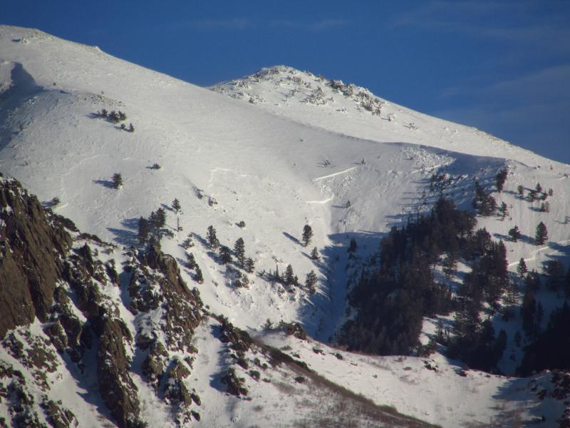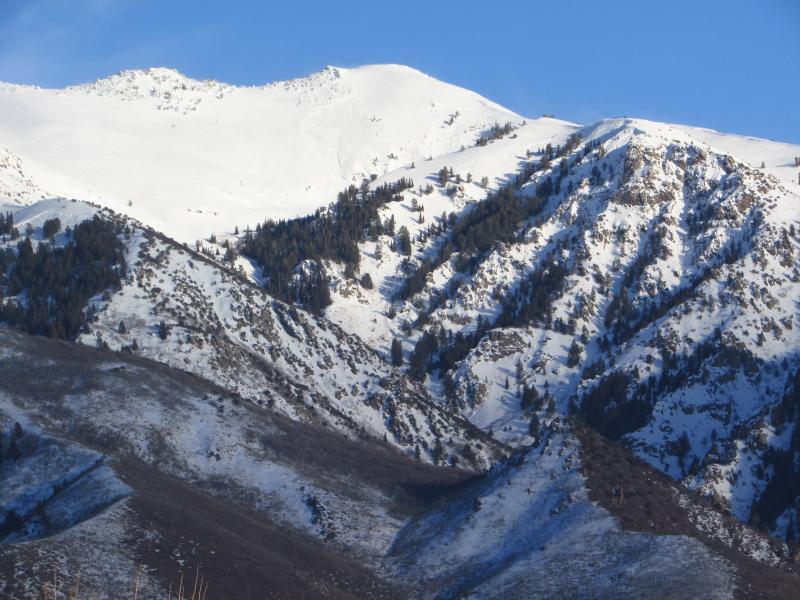 This beautiful blue bird weather today lead to some of the most impressive avalanche gazing that I have had in a long while, I was astonished to see this much activity still visible this long after such an interesting snow, wind, and rain cycle. I give credit to my wife for noticing what I thought was an optical illusion (turned out to be the main crown line off Thurston Peak) otherwise we wouldn't have made this discovery! I'm unsure as to when the cycle happened but judging by the nature of the deposition piles that we could spot, I would place them in the wet slab or wet loose and cornice release and likely the middle to end of this last week during the rain event and or the green housing and warming. In our investigation we counted 10-15 crown lines that may be connected from ridge line to ridge line and the large majority were on the middle 2/3 of main ridge, initiating on the northerly & northwesterly aspects of the westerly running sub ridges. There are so many avalanches over such similar terrain and short piece of the range I opted to lump these all in to one observation so to save some time. The pictures we took were all from the Wal-market parking lot in Layton off of 193 (it provided the best view from top to bottom and for the aspect) all pictures will be displayed observers left is north and observers right is south.