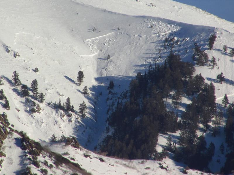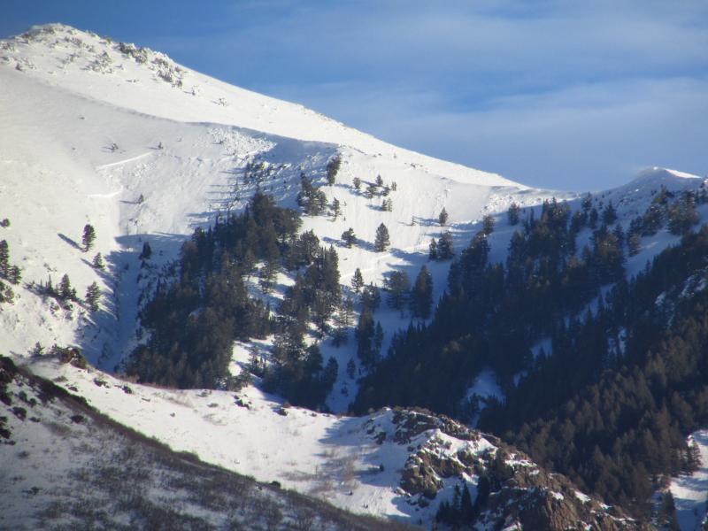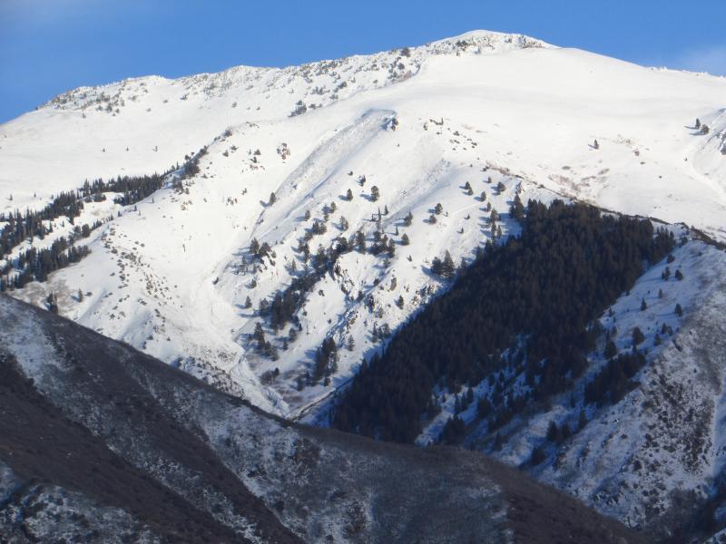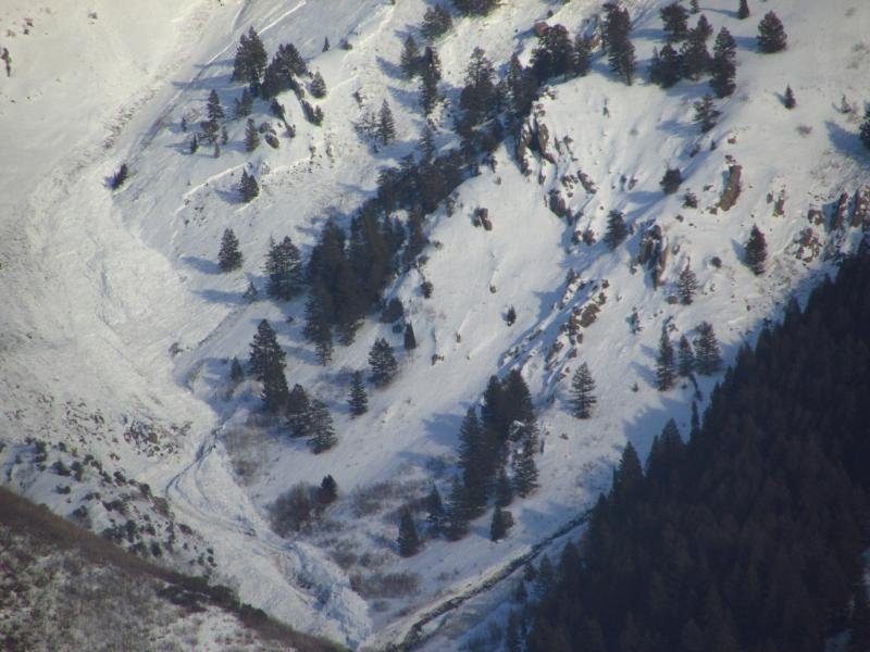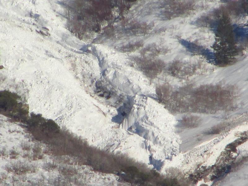 Picture # 13, 14, 15, 16, 17 are close ups of the Holmes Creek & Adam Canyon(very popular recreation Hiking Trail to a Waterfall at the bottom) 2 distinct Crown lines likely 3'+ with a step down in the mid slope of the second drainage observers right. What looks to be contious crown in measured over 3/4 miles on google earth and up to 2500' vertical run on each if they ran to the terminus, N-WS/WL-R4-D3-I/G Note the observers right side large Cornice release likely 8'-10+ in height steping to the ground likely what brought out step down on observers left. NC-WS/WL-R4-D4-G. This slide could have very easly covered the drainage and the trail at the bottom and likely made a large mess and killed anyone who was on that section of the trail or falls at that time.