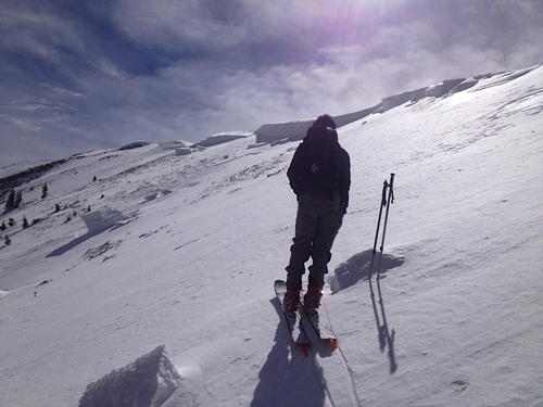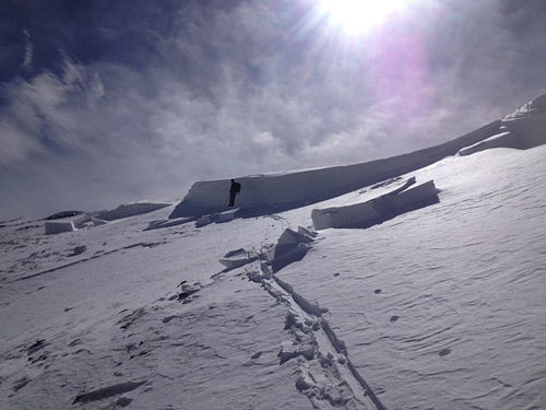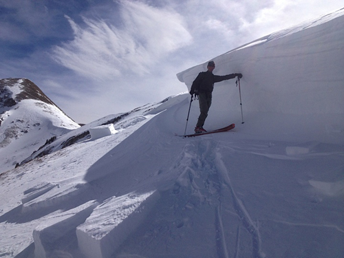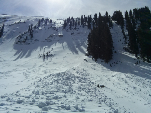 This slide was originally reported as only being about 50' wide and contained within Coyote Chute. Further examination showed that it wrapped around the corner and up the ridge, extending for some 800'. Crown depth varied from 18" up to near 6'. Because of wind scoured surfaces, crown tapering, and the fact that it wrapped out of sight around the ridge,made it difficult for original reporting parties to observe the full extent of the avalanche.