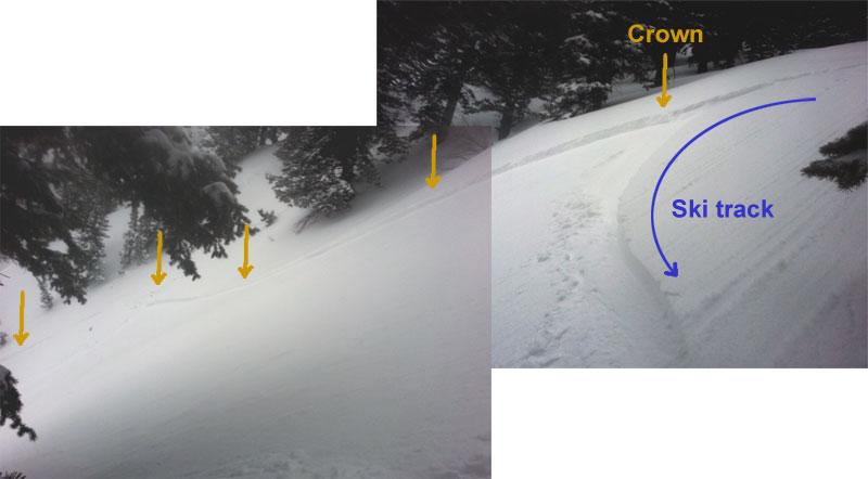 Party of three riding in generally boot deep snow with stable conditions in mostly north / north-east terrain. I came to a spine type feature and rounded from the left side northern aspect to the right side of the spine which has a slightly southern aspect to it. My ski cut became the left flank of a small slab in an hourglass feature about 40' across. This was the starting point but the entire adjacent slope fractured and slid. I was astonished at how fast this slide accelerated, entrained more snow, and shot down a bend in the gully to my left and out of site. If I pointed myself straight down hill I doubt I could match the speed at which this slide took off with. The crown where it started was about 9" deep with clearly visible layering in it. I regret that I did not stop longer to investigate the bed surface. It seems like even though there was cloud cover and cold temps the snow on the slightly south aspect was feeling some radiation from the sun and reacted unexpectedly. The avalanche forecast this morning did mention pockets of instability and possible wind slabs buried under new snow.