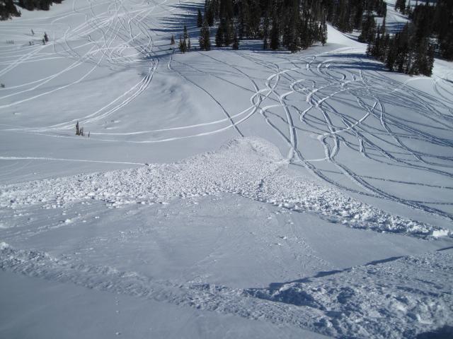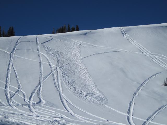 This is likely a sled triggered slide from a day or two ago.  It was either triggered as the rider was coming down from the top or side-hilling across the slope.  Nothing too big or deep, and was probably pretty easy for the rider to throttle out of it as it broke at their sled and not above them.
