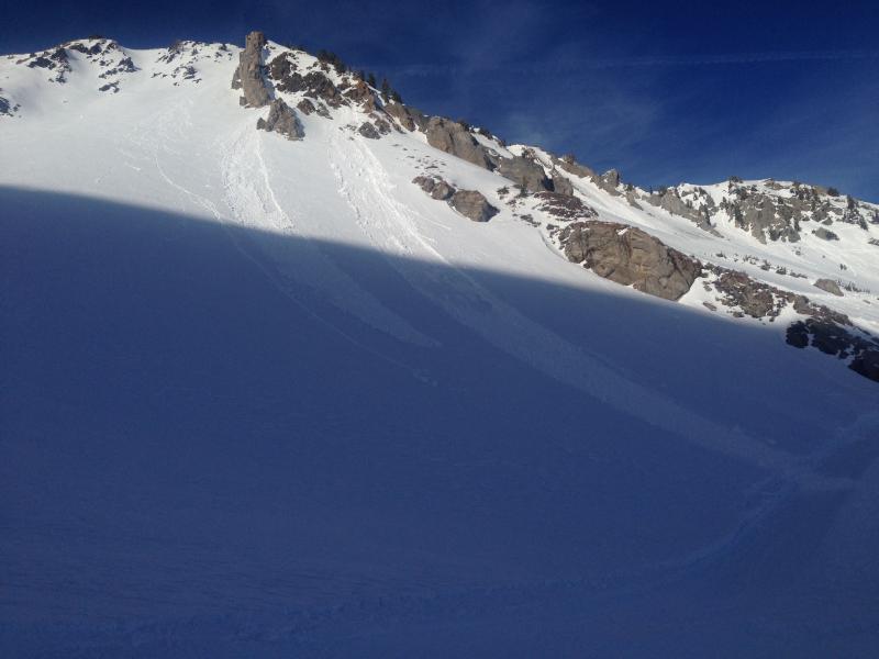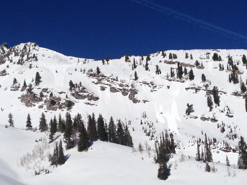 Spent the day in Mary Ellen Gulch making observations and familiarizing myself with terrain. Skied the southern aspects before 10 am and got out from underneath the steep paths and well away from run outs. The wet activity started around 10:30am and lasted well into the afternoon. The last significant release was between 14:00-15:00 and ran several hundred vertical feet. The drainage was a mixed bag of orange-peel, wind-effected snow, settled powder, and sun-effected mank. Good, safe skiing was found on mid elevation terrain features in the middle of the drainage. Snowmobilers were getting after it with their high marking in the Outhouse Chutes and the Y-Not zone. WPG had a blast skiing around the compass it seemed.