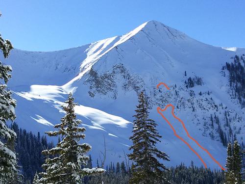 Avalanche initiated as a small wind slab release above the cliffs on the lower lookers left of the Tukno East Face. Slide ran over the cliffs and triggered a larger slab under the cliffs at the top of Tele Gold.