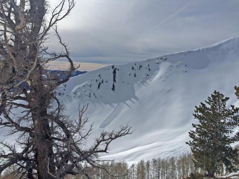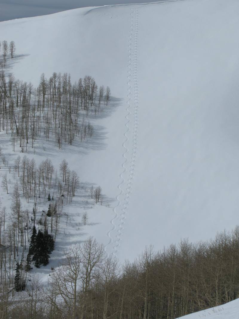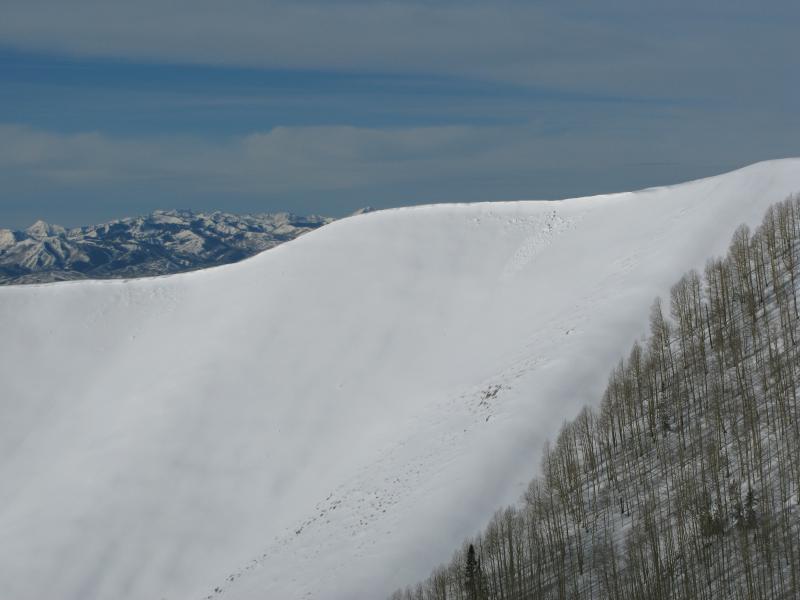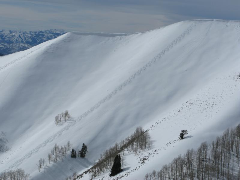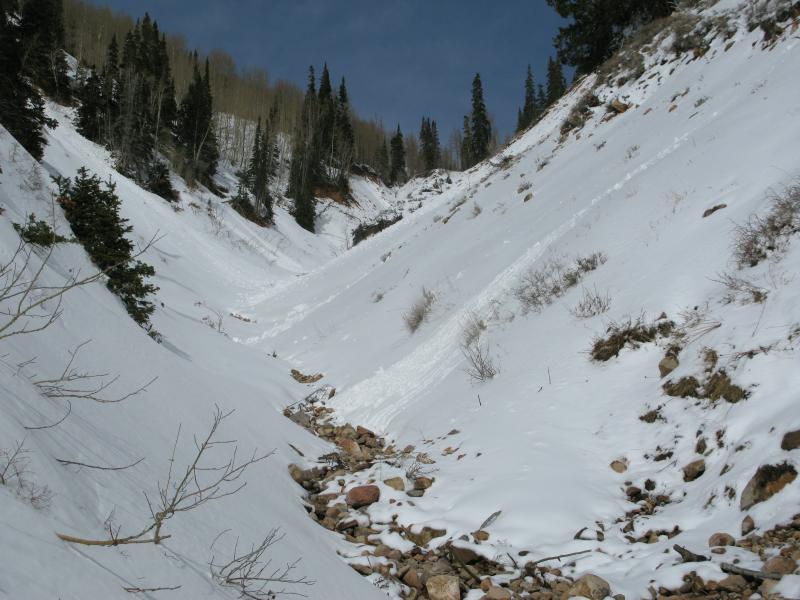 A few drainages to the west in mid Weber Canyon we found much less wind effect and natural cornice failures produced no avalanches.
