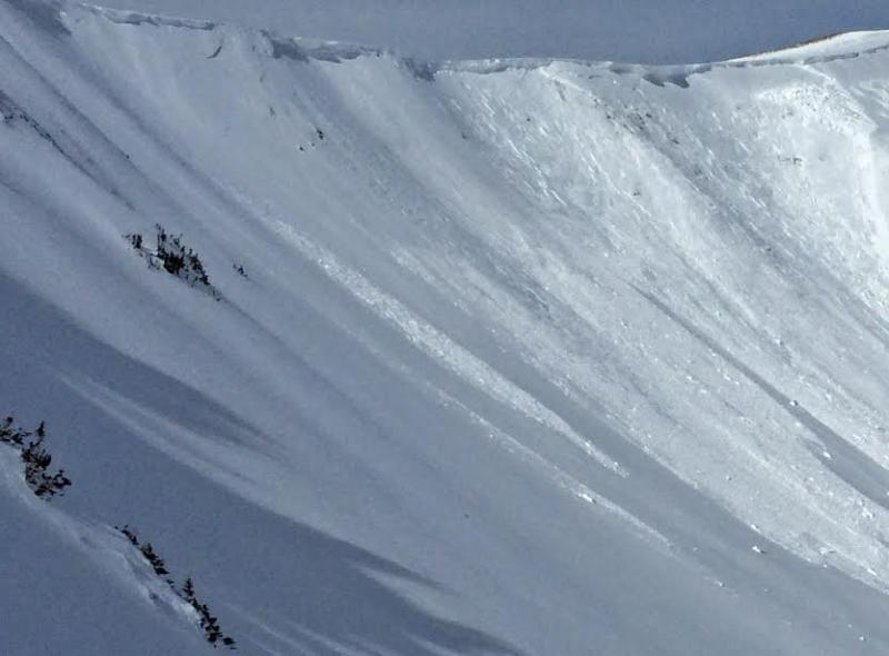 Strong westerly ridgetop winds drifted recent storm snow to the leeward side of upper elevation terrain in the wind zone. Cornices were particularly tender, breaking further back than you might expect, and initiating slabs as they trundled steep terrain below.