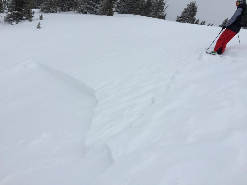 Slope cut on a north facing slope in Upper Weber Canyon produced a 70-ft wide 1-2 ft deep wind slab. It moved slow at first but picked up speed fast and entrained the gully to a pretty impressive dust cloud running to the flats. Could of easily been rolled pretty hard by this slide.