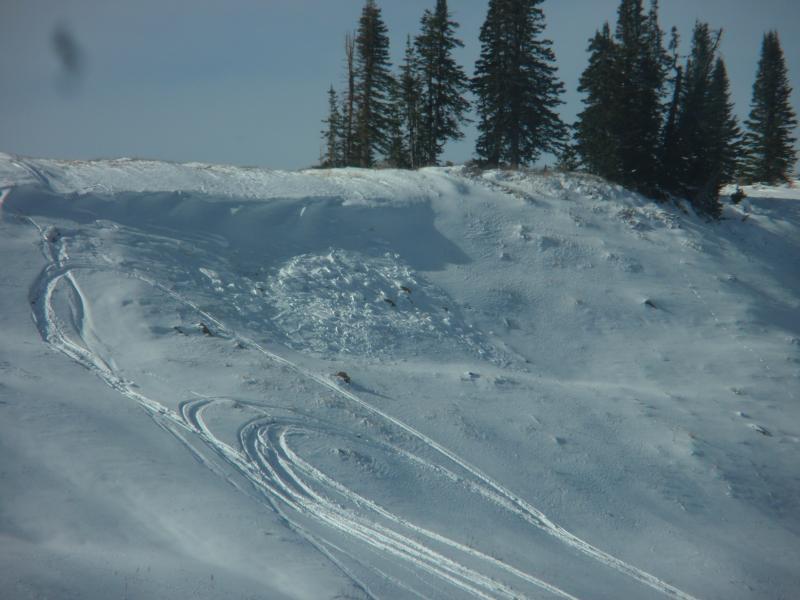 Looks like it was triggered by a snowmobile, just at the break of the ridge, Last weeks observations found that the old snow had faceted and we got a release of the of a small slab, much the same.