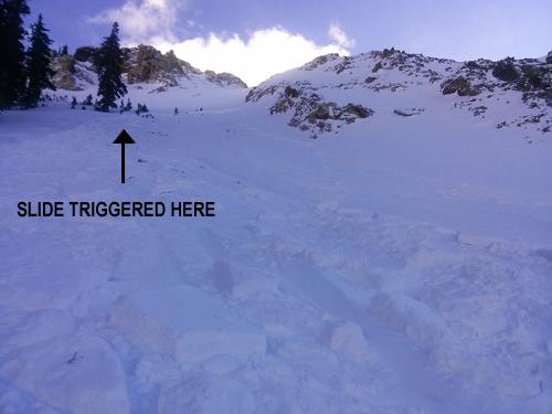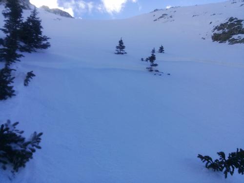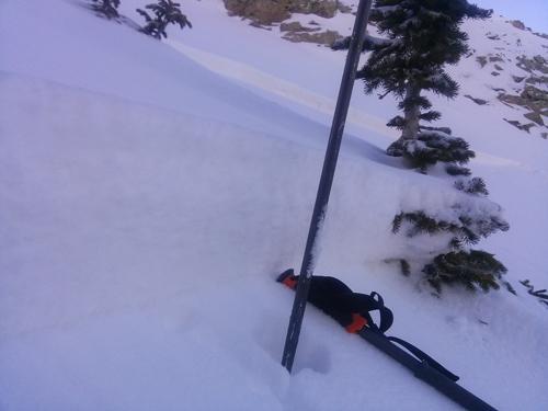 The slide was 3" at my skis and propagated horizontally out to my left. Approx. 40' at the start w/ a maximum depth of 12". After a few turns I could feel (and see the slide). At the same time my partner yelled to cut out, which I did at a 45 and was out in a second to a safe zone. As the angle eased up the slide stopped before the flats. While unintentional, it was suspect and I found the sweet spot. Could not have buried, but a few rocks got exposed and enough power to wrench your knee..