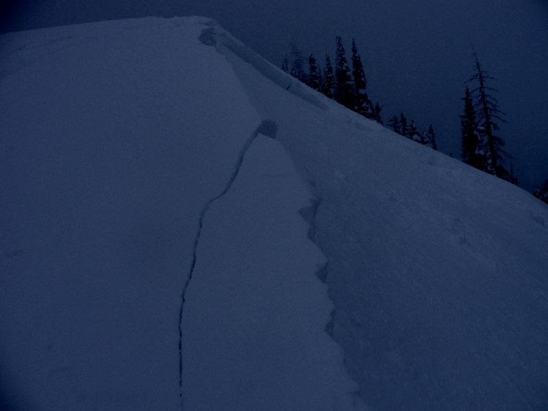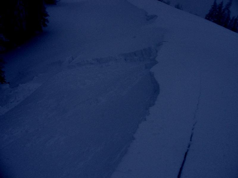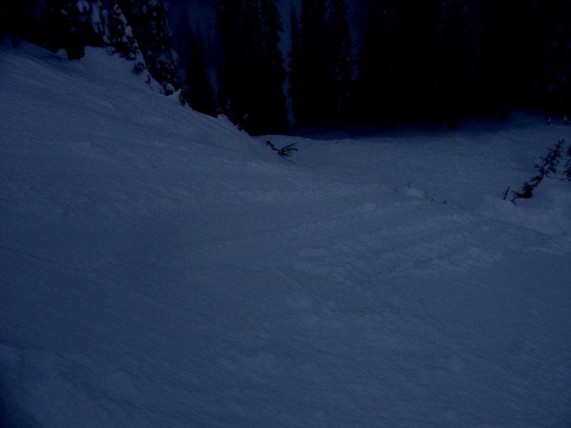 I ski cut this slope last week and it slid, the same slope naturaled sometime since then, I ski cut the cornice today and it slid yet again. Today was the largest of the three. I think it's worth noting the none of the new snow is sticking to the basil facets.