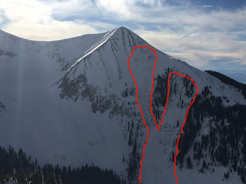 This report is for the slide to the observer's right. Slide on left ran full depth and is detailed in another report. One or the other is likely a sympathetic release. Slides likely ran during the storm on December 25 or during the wind event of Dec 26. Difficult to tell from a distance but slab on right was likely comprised of snow accumulated from several storms between Dec 18-25 running on the old snow surface that existed prior to the storm cycle.