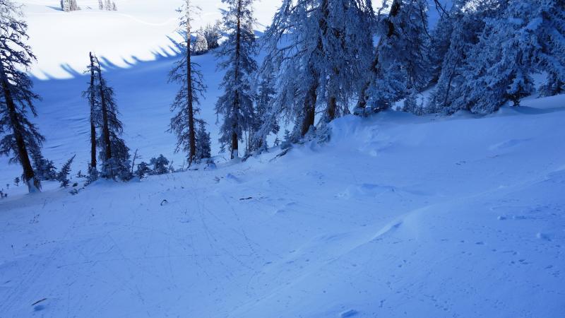 This is a repeater in an area that previously avalanched during the solstice cycle. Likely failed Monday during the high winds. Dug a pit right next to the crown and couldn't get propagation and structure was not overly weak. This shows the pockety nature of this problem, with slopes that have previously avalanched now very difficult to distinguish from those that haven't.