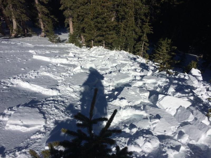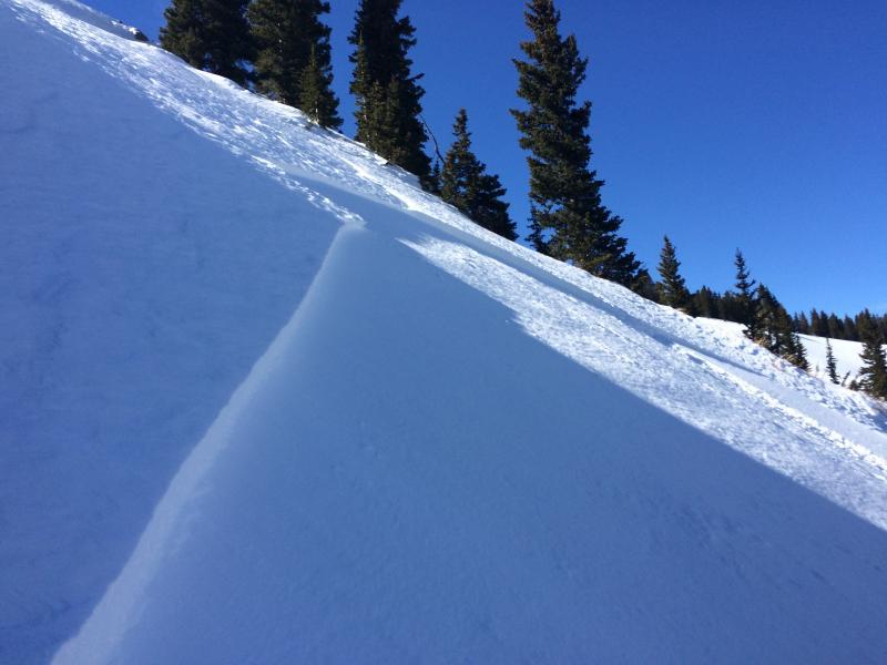 Decending off of Crucifix ridge adjacent to Colorado bowl directly North. Concerns for the day were a persistent weak layer at 8-11 inches along with wind slabs in exposed terrain. There were three of us two split boarders and a skier. We managed to highlight the concerns for the day. We took turns making the best of wind board at about 30-33 degrees for the upper part of the slope, the last pitch before we entered the trees was anywhere from 35-38 degrees with a small outcrop of rocks above the final open pitch. This slope turned out to be a wind slab up high and a transitioning softer consolidated slab below prior to entering the trees. Before entering the final pitch I set up on the right side, Michelle set up above and Brian on the left flank. Brian asked for eyes and proceeded to make three turns in which the slope proceeded to pop out. Brian recognized the fracturing snow around him along with the yells of his buddies and rode off the fractured slope into lower angled treed terrain off the right flank. The debris pile initially ran through some small trees and then built up to anywhere from 1-4 ft with the wind slab chunks.