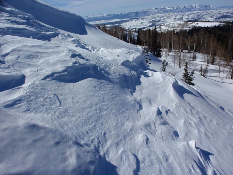 Soft slab just under the cornice, a number of these were seen along the ridge tops, while we only had about 2 to 3 inches of snow, high winds built up the cornices. The winds were strong enough to take out tops of a number of trees just below the ridge. Snow surface was soft powder with still some loose snow available for transport. As I was leaving the south winds were picking up and loading the cornices. The cornices were welded in place and only the new snow would break loose.