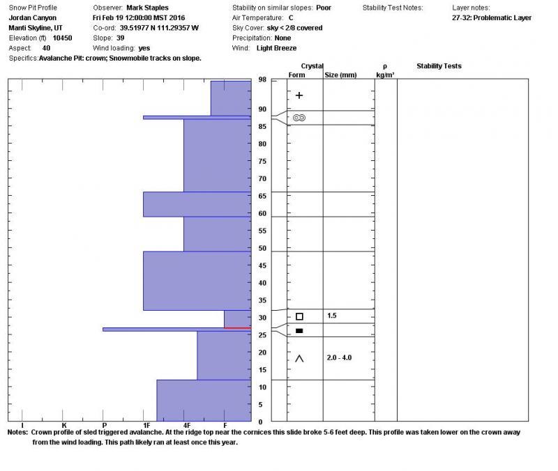 This snowmobile triggered slide occurred at approximately 1200 moments before we arrived. The crown depth ranged from 2 feet to 6 feet where it was wind loaded near the cornices. On the edges of the flank below the ridge a little bit, snowpack depth was 3.2 feet which is very shallow. This path likely ran in late December based on this shallow snowpack depth.