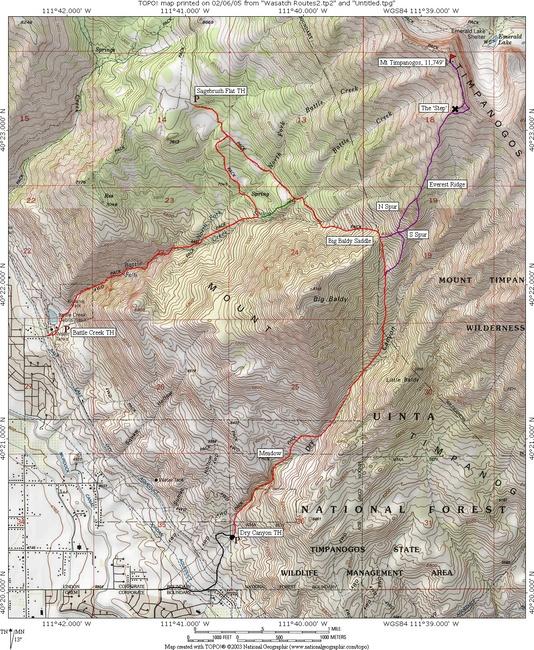Map below from Summit Post web site, showing Everest Ridge on Mt Timpanogos.