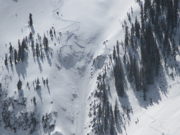 This avalanche path has been very active this season, releasing twice naturally. On December 26, it fractured 6-7' deep and ran full track, or approximately 3000' taking out small trees going up the bank on the far side, and rounding the corner into the main drainage of Gold Basin.