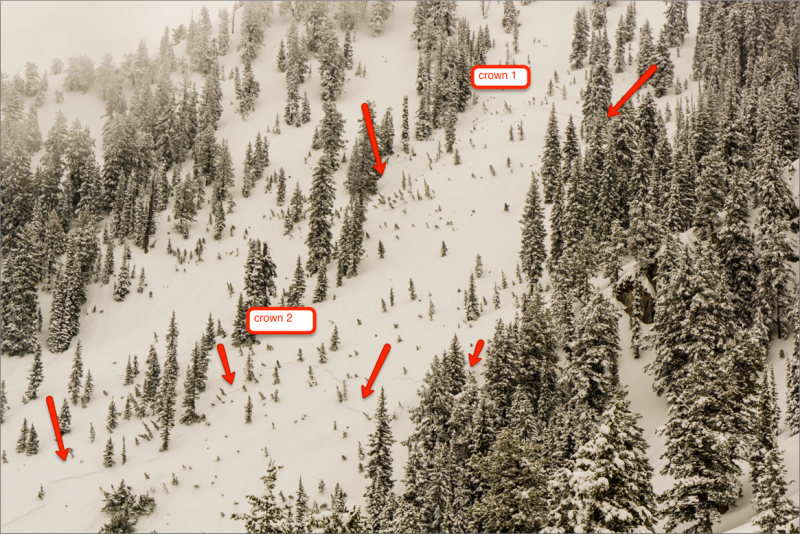We also encountered two other smaller slides. One was on the east ridge of the same bowl and appeared to have broken all the way up on the ridgeline; it ran all the way into the bowl (3-400'?). The other was visible on a similar aspect ridge further west, also running down the west side of the ridge into a larger slide path.