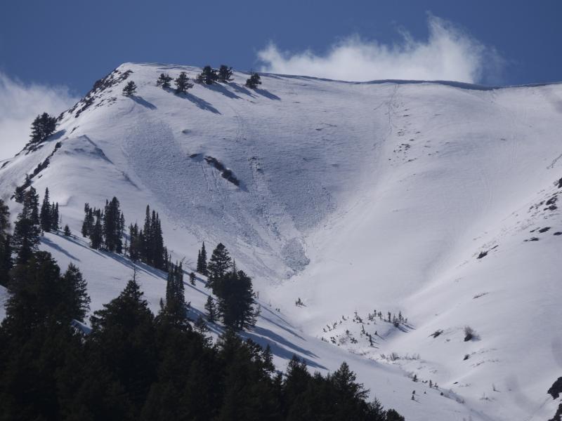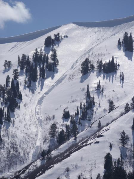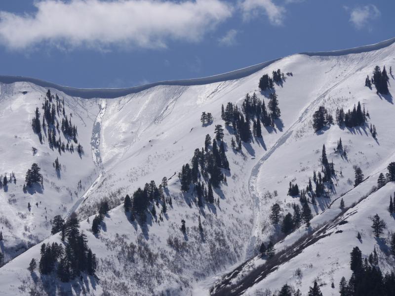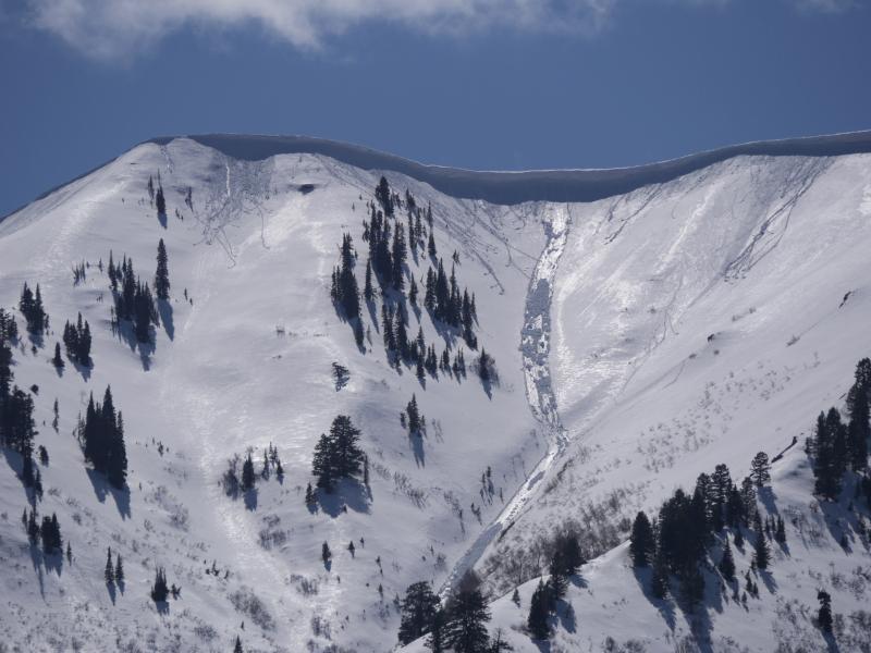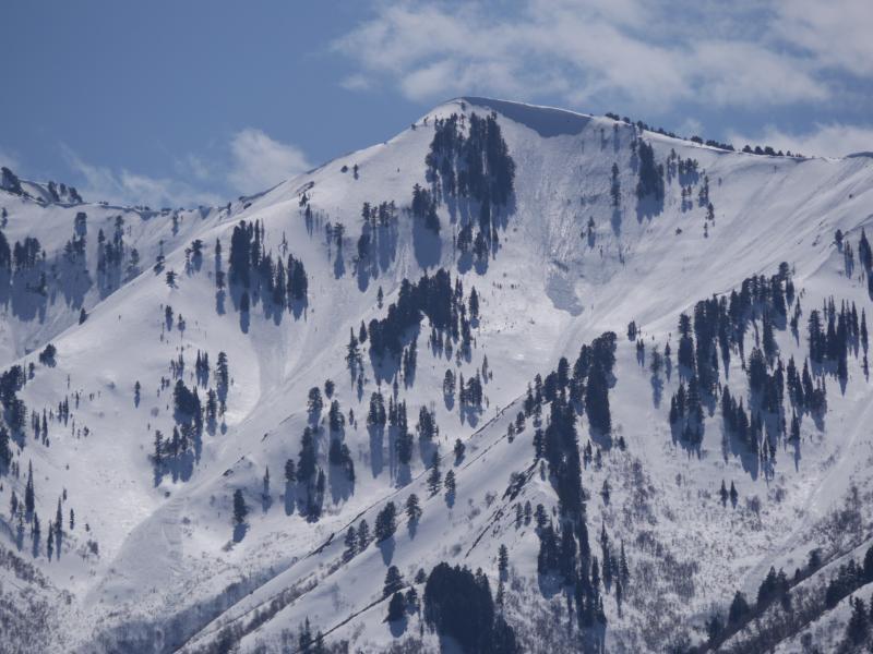 I took pictures of these natural avalanches on the east side of the Wellsville Range the afternoon of 4-5-16... I last looked at these slopes on Saturday afternoon and this activity wasn't there, so the wet avalanches ran over the weekend or on Monday 4-4-16... Several look to have been initiated by cornice fall...