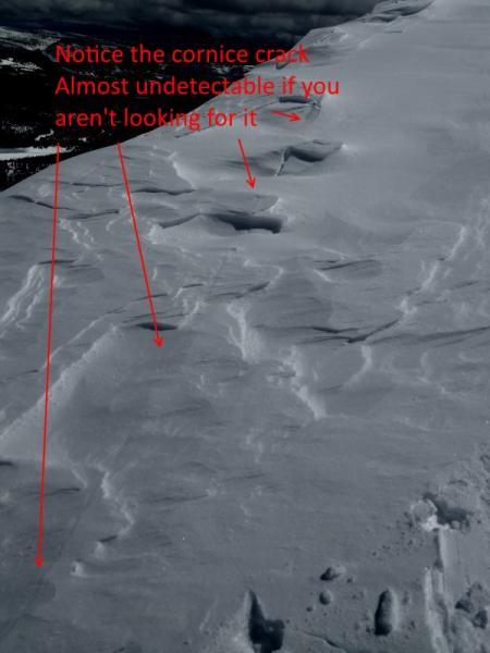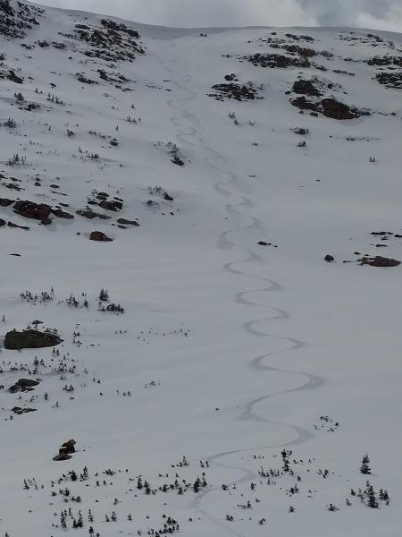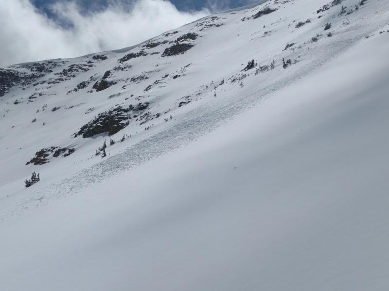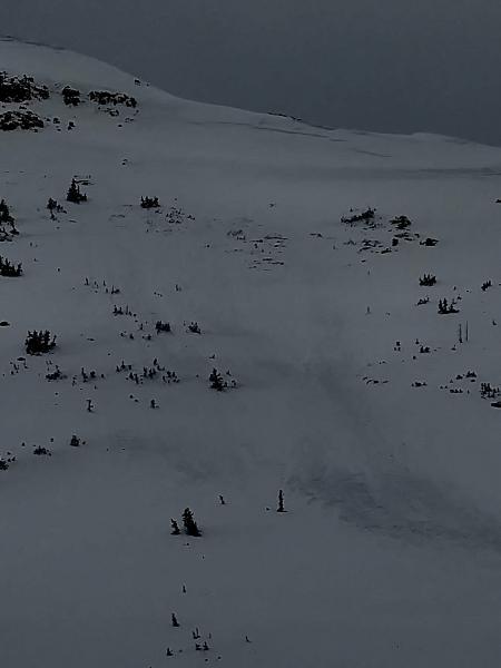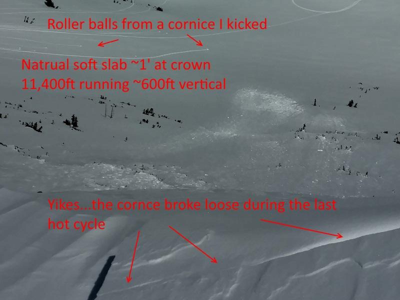 I headed up to Mt. Watson today to do some skiing. The first mile of the road had about 4-6" of new snow otherwise it was pavement. On the way back it was totally melted out. I expect the plows will move the end of the road up a mile tomorrow. Once up in the Mt. Watson area it was I was greeted with 8-10 of new snow in the fields below the towing peaks. Since the south wind that accompanied the storm had loaded the north slopes, I decided to skin up to the north east facing couloir on Notch Mountain in hopes of ski cutting a slide. I ski cut the loaded rollover at the top with no results. I headed back down the south side for some safe south facing low angle skiing. After a few laps the skies began to clear enough to get a better view of the wind loading on Mt. Watson. To my delight, there was minimal wind loading. However, I noticed this shallow but wide soft slab avalanche that occurred yesterday. Judging by the length that it ran, it was a slow mover and given the shallow depth manageable if in a narrower line such as the one I skied.