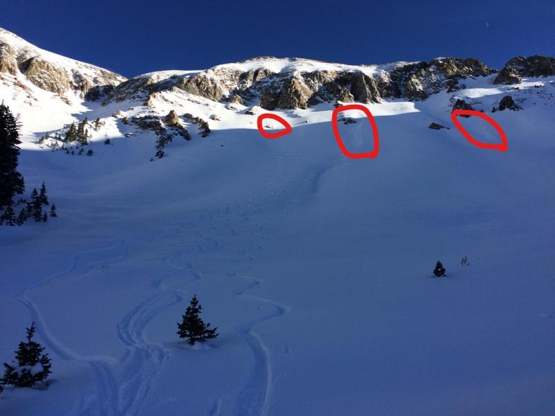 Photo in reference to Ed Grote's report included in the 12/5/16 advisory. 2 natural slides on right side of photo and 1 skier triggered in leftmost red circle. Skier triggered slide was a small pocket of soft wind slab, approx. 3 m across and ran about 50 ft. The soft wind slab causing all 3 slides was deposited on the leeward side (skier's left) of small rock outcroppings. No other signs of snow instability were observed.