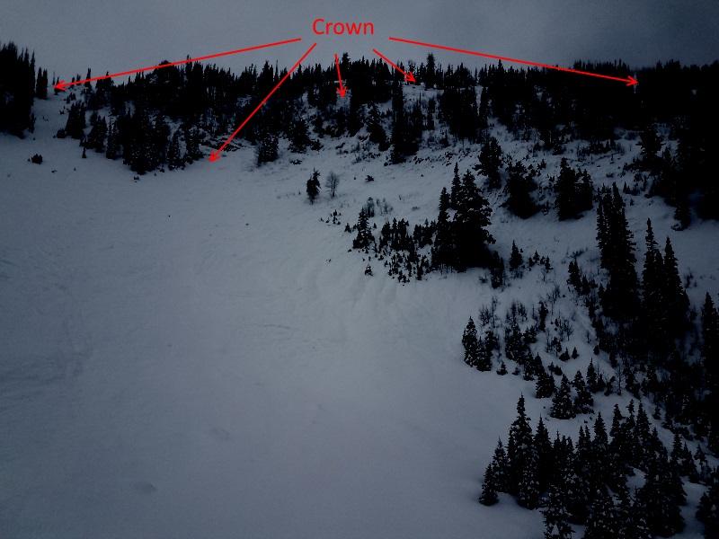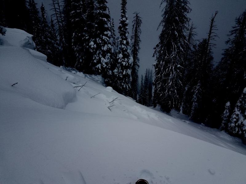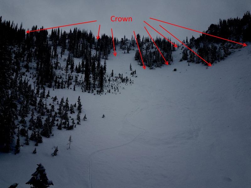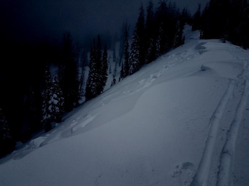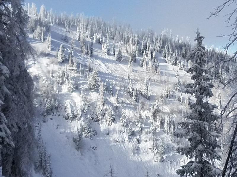 I discovered this very wide slide today. Not very deep. but it ran all the way to the base. In exposed terrain where the snow pack was shallow it pulled out the entire snow pack and in others just the new snow. I believe this naturally slid just prior to the cold snow we got last night.