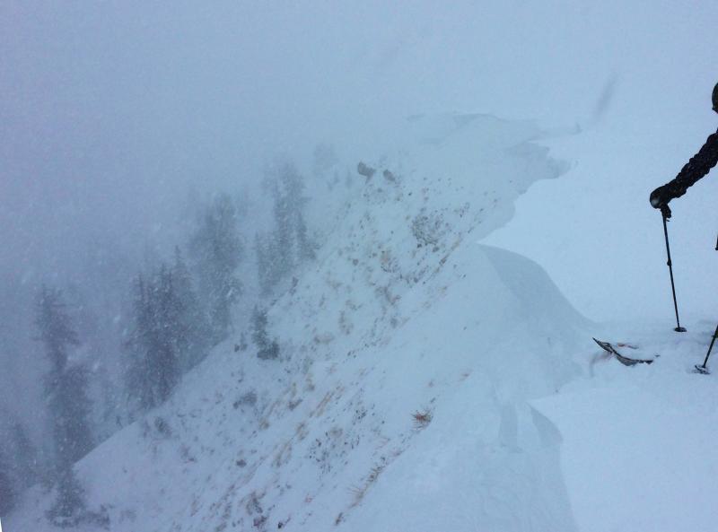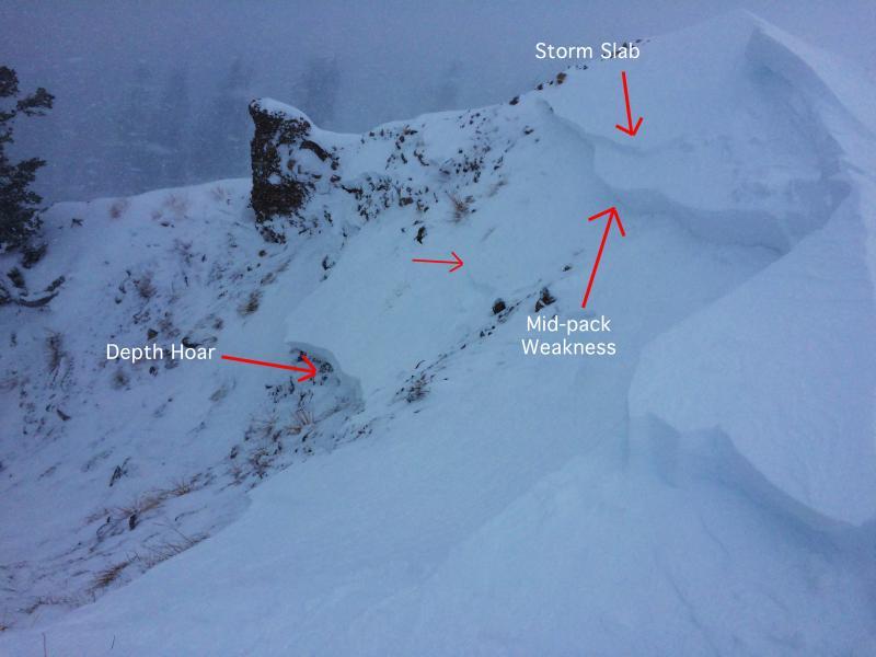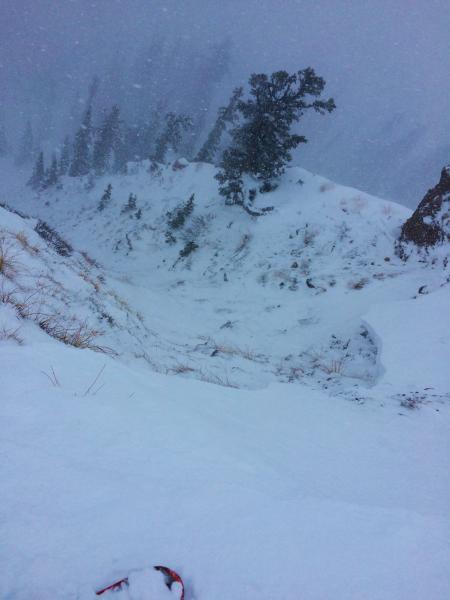 Full depth deep slab avalanche R4 D2. Partner dropped a small soft cornice onto a steep starting zone (~45+*) which triggered the new storm slab. This then stepped down to the mid-pack weak layer (guessing a buried NSF layer similar to that being seen in the Wasatch). Then stepped down again to the ground on what I am assuming is old buried weak snow (pre-Thanksgiving day storm, being a upper elevation steep rocky north facing chute, this is exactly where I would suspect there to be a more substantial layer of more developed basal facets then seen elsewhere). The majority of the chute was ~42*.