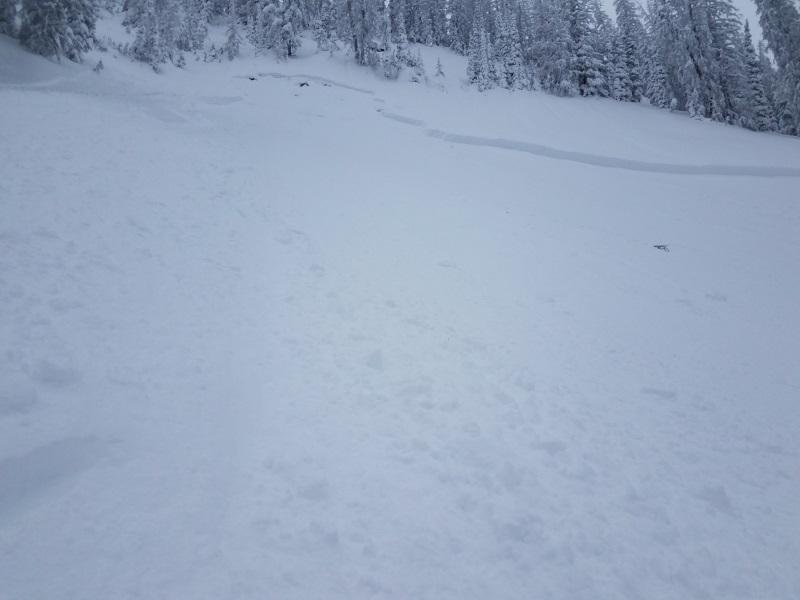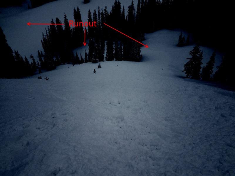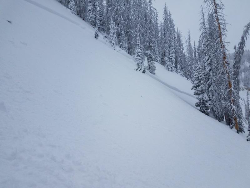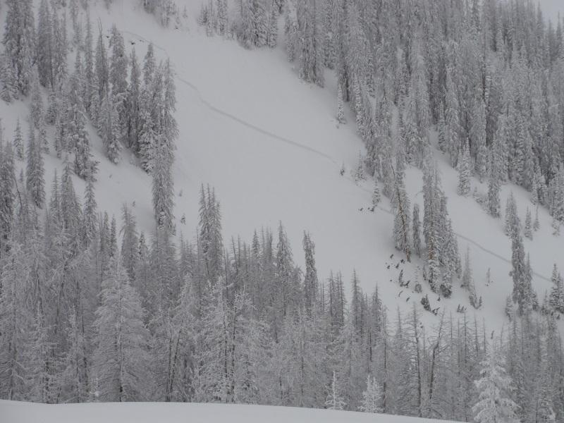 I set off this R4 D2 slide on Hoyt Peak today and got caught. Prior and up above I safely ski cut and sluffed out the slope in the very steep terrain. I have been watching this slope all season and it had not yet slid which is unusual. I was hoping the snowpack had bridged the covered rock band in the top third of the slope and in fact I was right. Although I had already sluffed out the slope, I made the mistake of thinking the slope would not slab out on me or if it did I would be able to get off to the side quick enough. After carefully skiing the 50+ degree terrain up top I straight ran the even steeper covered rock band. Once I cleared the rock band and now on lower angle prime avalanche terrain, I made the mistake of checking a little speed which resulted in the slab pulling out. I lost a pole, goggles and my dignity but left with my life, my skis, my hat, a pole and my pack.