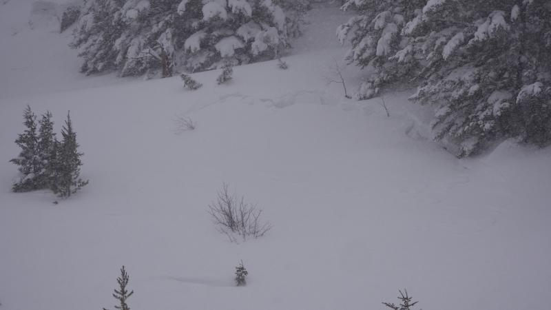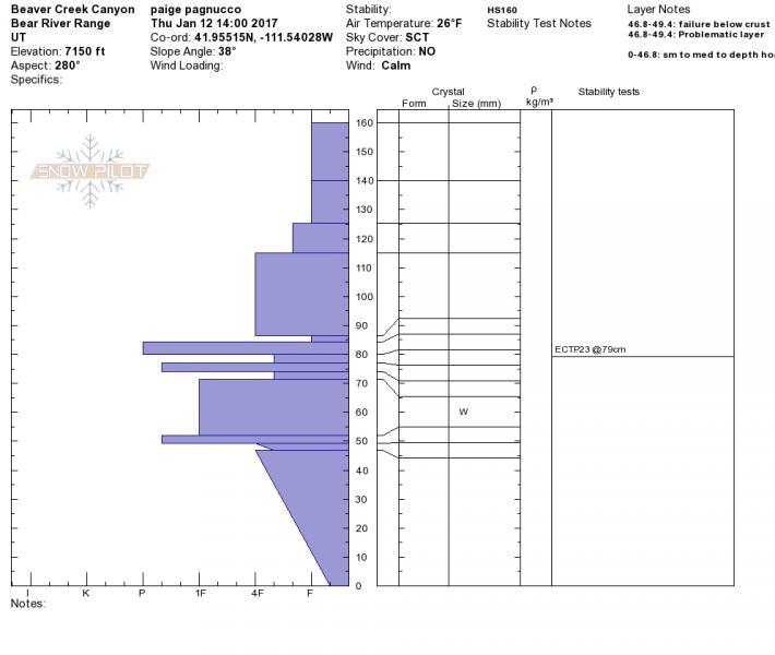 Paige Pagnucco investigated the avalanche on 1/12/17 and found the weak layer to be small facets sitting just under a thick but brittle crust about 50 cm up from the ground. The area is very rocky underneath the bed surface and facets of various sizes exist. The trigger appears to be the intensified snowfall rate that occurred during that time. Combined with strong winds, the weight of the new snow overloaded the weak layer and caused it to fail . The avalanche occurred on the lee side of a small subridge. The height of the slab was 85-110 cm.
