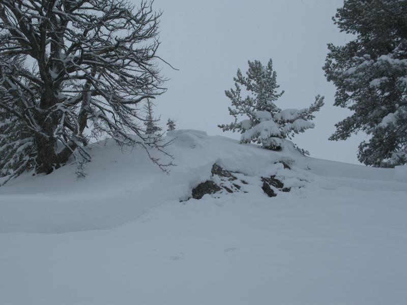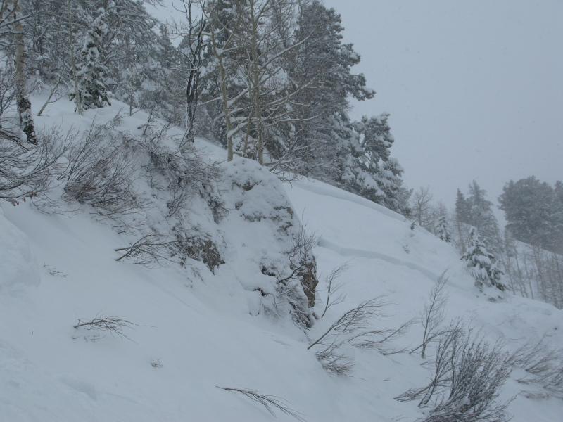 A closer look at the shallow snow that barely covered the small rock band where the slide was initially triggered.