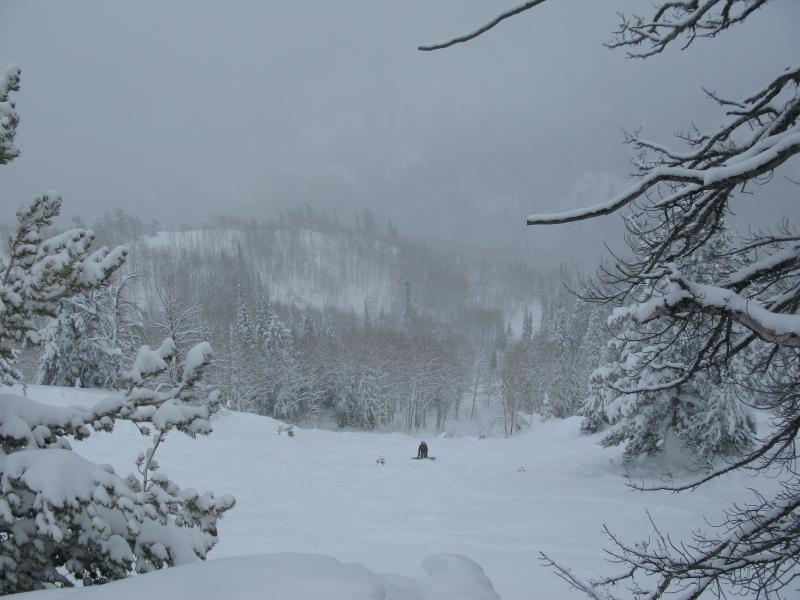 The starting zone consists of a steep, rocky ridge, with a small hanging bowl that dumps into a once tightly treed runout. Image above is looking downslope from where the rider jumped off a small rock feature.