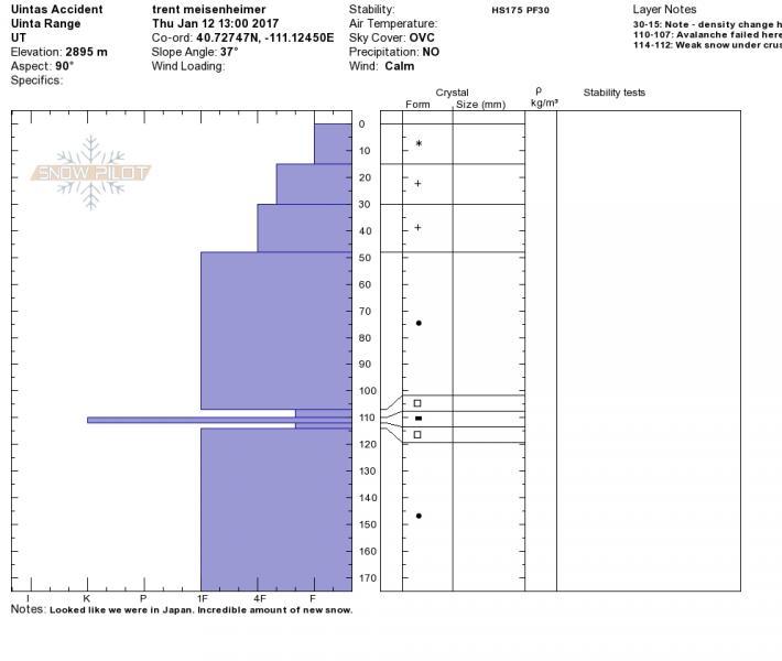 The image below is a snow-pit profile done at the crown of the avalanche. We found that the avalanche failed on a thin layer of faceted snow that was sitting just above a crust in the mid-portion of the snowpack.