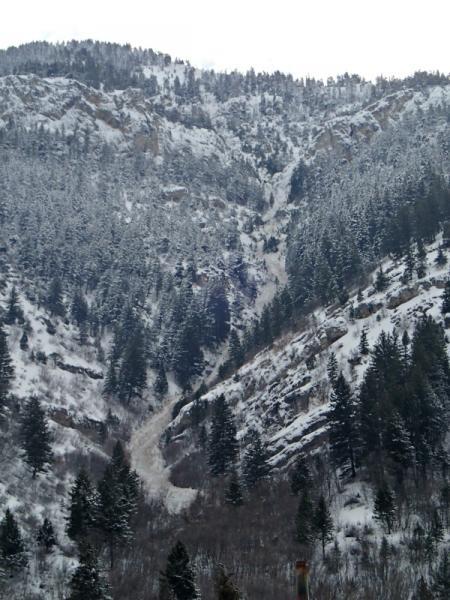 One the way down the canyon this afternoon we noticed a recent large slide in the canyon right behind the old Zanavoo Restaurant. The slide started on a steep north facing slope around 7600 feet and traveled 2400 vertical feet down to 5200 feet. There was no fresh snow on the debris pile so it likely happened yesterday or today before 2:00. It was a pretty impressive slide gouging down to dirt and mud and leaving a significant pile 10-15 feet deep.